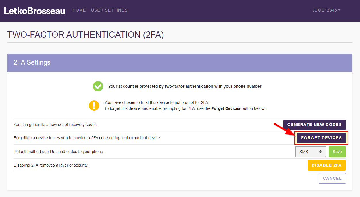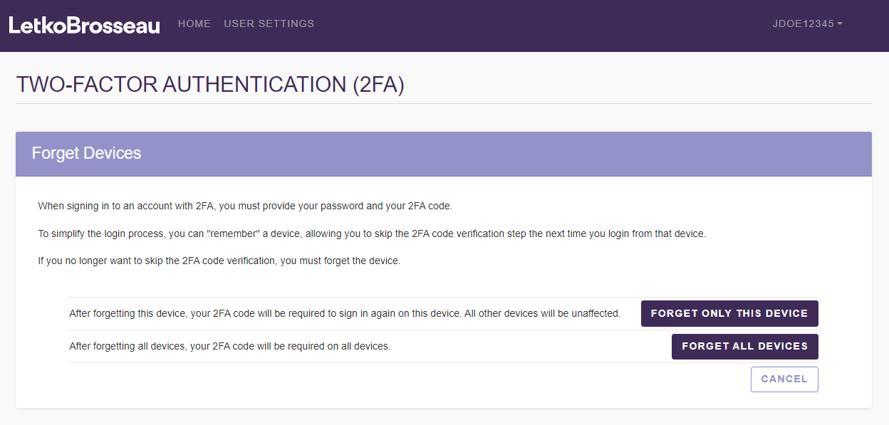 If you decide to "forget" a device (in other words if you want to disable the "Remember this device" feature), the client portal will once again start prompting you to provide a 2FA code in order to log in from that device.