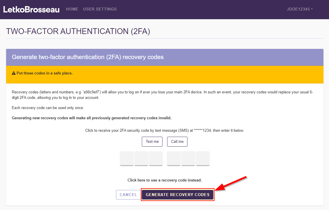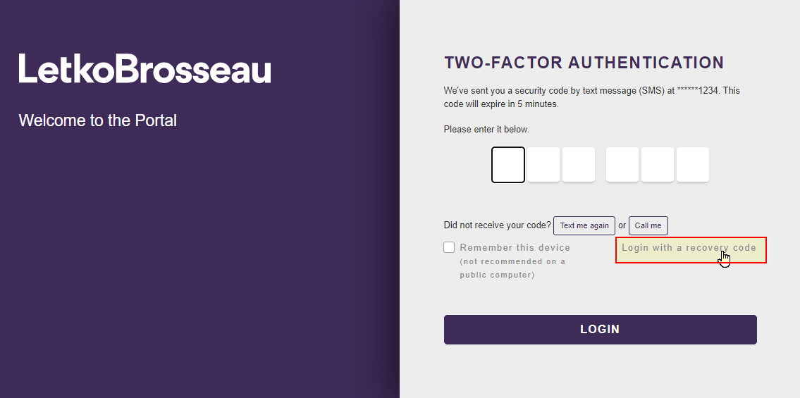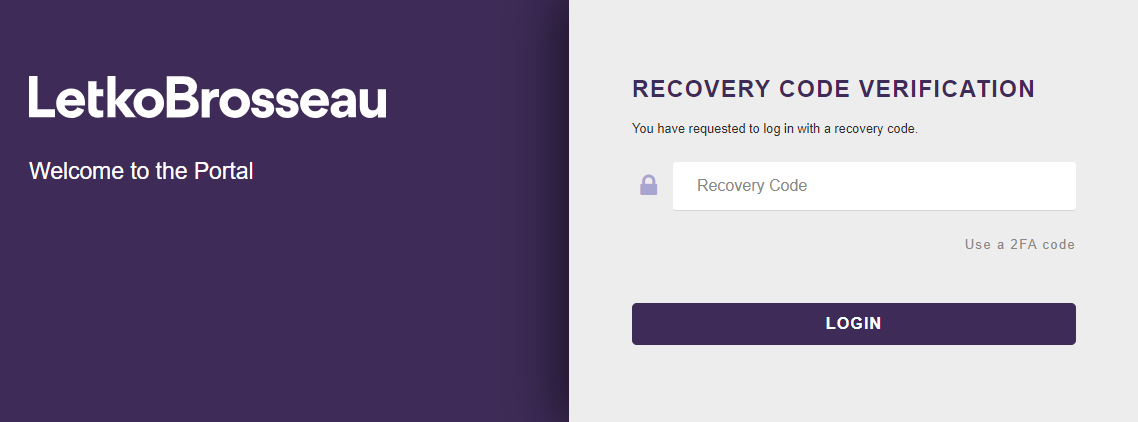 Recovery codes will allow you to connect to the client portal if you ever lose access to your 2FA device (e.g. if it is lost or broken). The goal of recovery codes is not to replace your usual 6-digit security codes, but rather to act as a backup method of connecting.